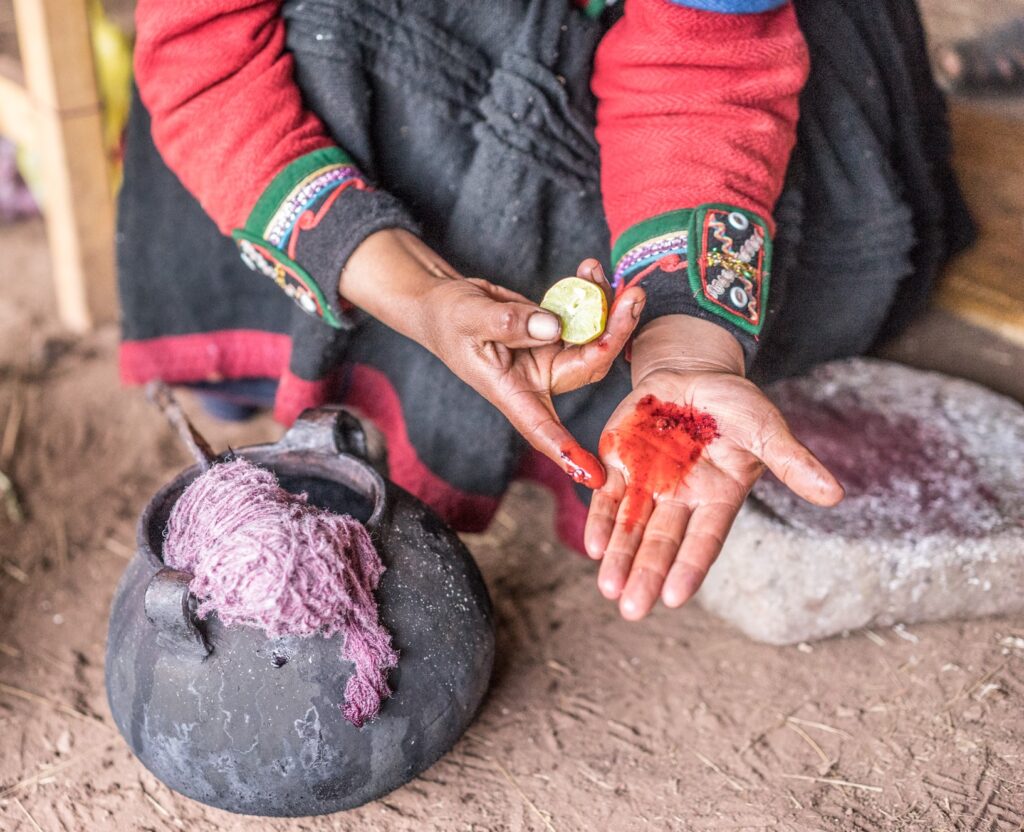 Este proceso es muy importante donde aprenderás todas las técnicas y procesos de tintura de la fibra con tintes naturales, utilizando hojas de plantas nativas, tallos, flores, semillas, raíces, minerales, insectos, etc.